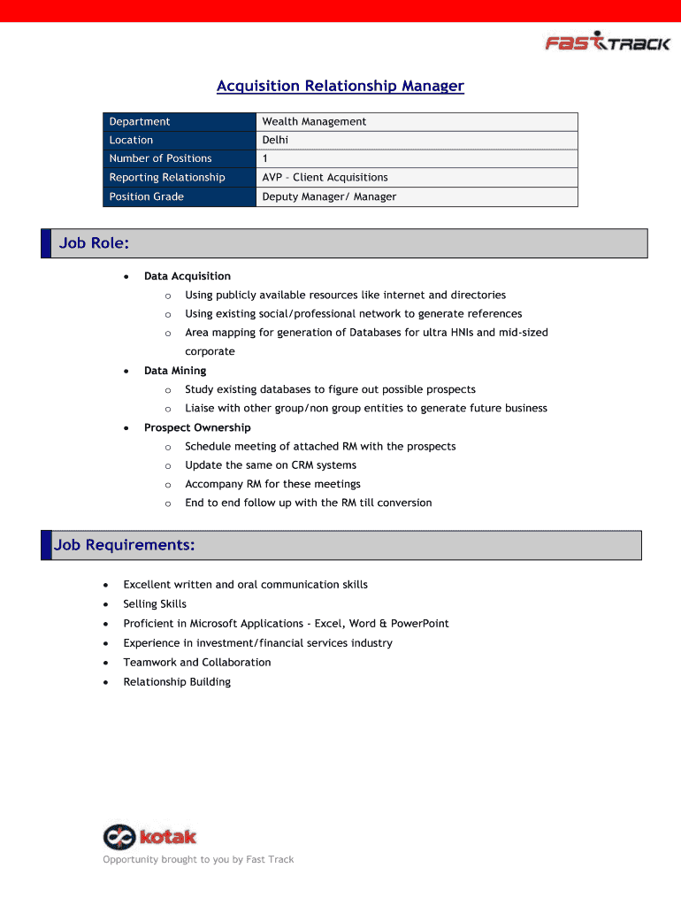 Acquisition Relationship Manager DepartmentWealth ManagementLocationDelhiNumber of Positions1Reporting Relationship AVP Client AcquisitionsPosition GradeDeputy Manager/ Manager Job Role:R o l data