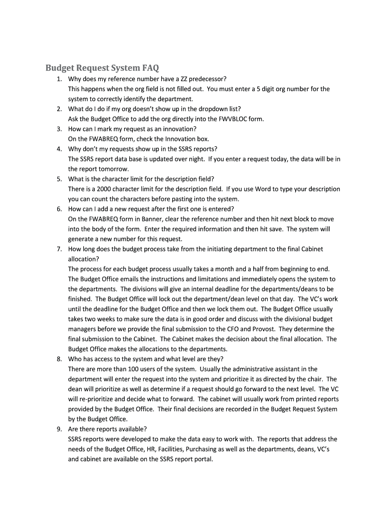 The budget request system faq is a set of frequently asked questions regarding the budget request system.