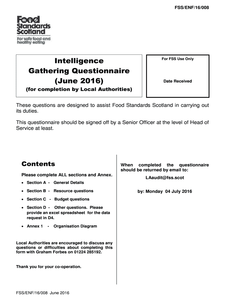 FSS/ENF/16/008Intelligence Gathering Questionnaire (June 2016)For FSS Use Validate Received(for completion by Local Authorities) These questions are designed to assist Food Standards Scotland in carrying