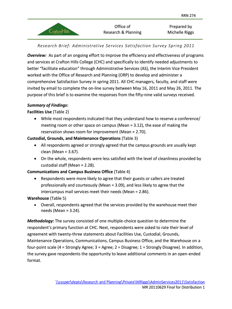 RRN 274Office of Research & PlanningPrepared by Michelle RiggsResearch Brief: Administrative Services Satisfaction Survey Spring 2011 Overview: As part of an ongoing effort to improve the efficiency