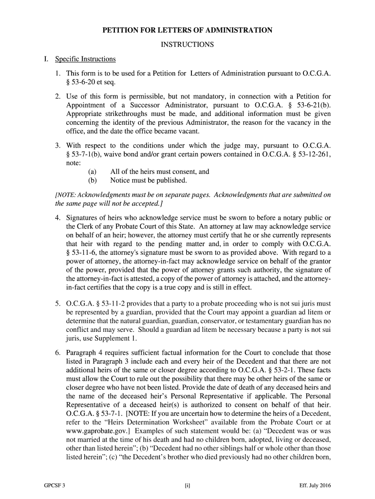PETITION FOR LETTERS OF ADMINISTRATION INSTRUCTIONS I. Specific Instructions 1. This form is to be used for a Petition for Letters of Administration pursuant to O.C.G.A. 53620 et seq. 2. Use of this