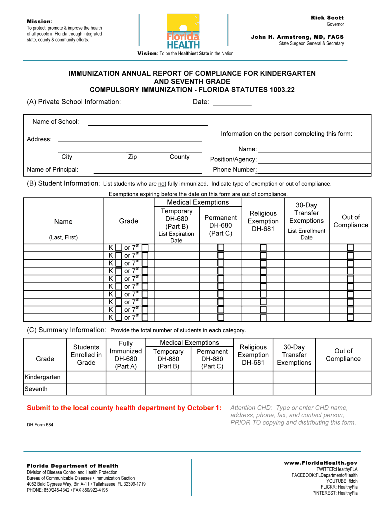 Get the free IMMUNIZATION ANNUAL REPORT OF COMPLIANCE FOR KINDERGARTEN