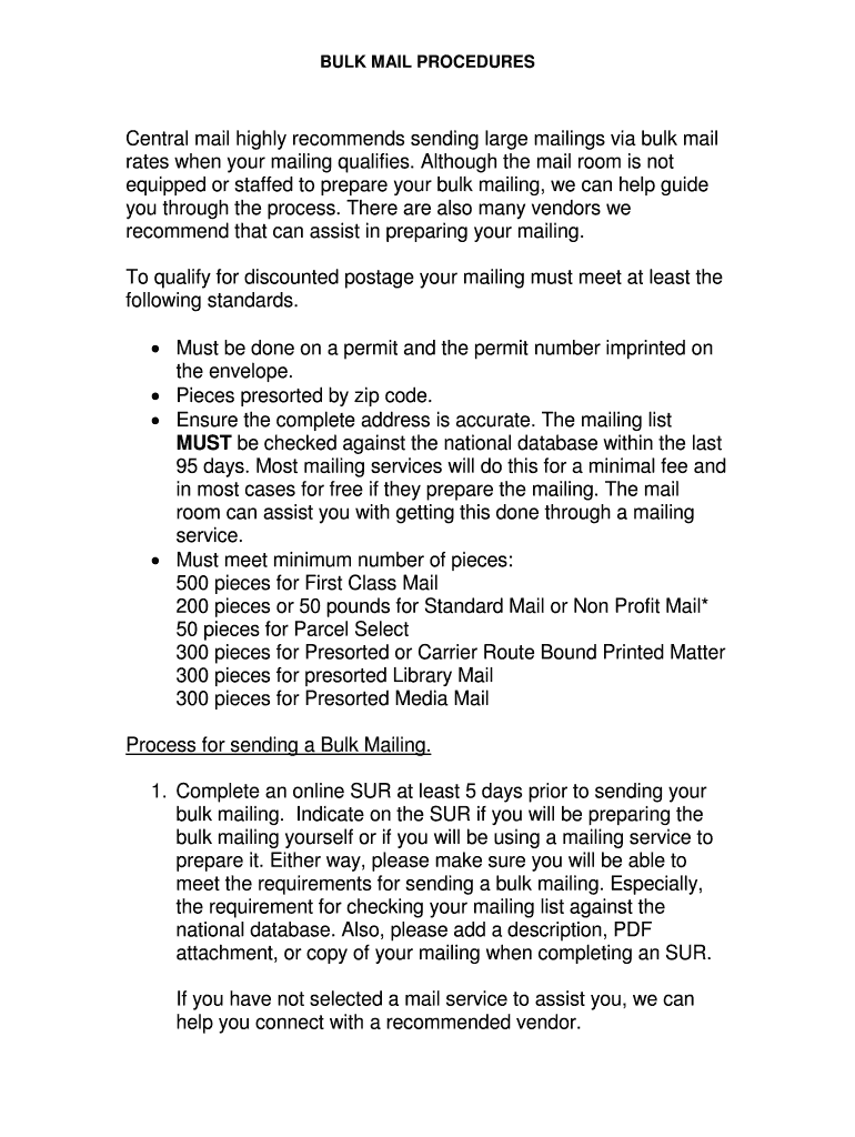 BULK MAIL PROCEDURES Central mail highly recommends sending large mailings via bulk mail rates when your mailing qualifies. Although the mail room is not equipped or staffed to prepare your bulk mailing,