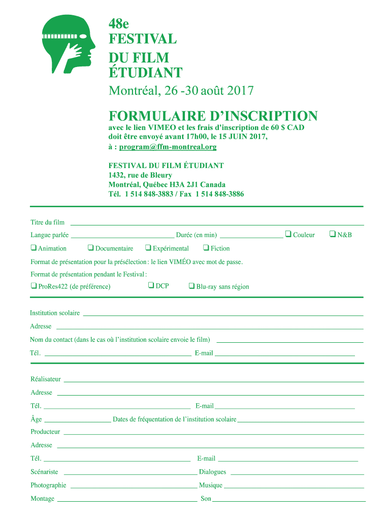 48e FESTIVAL DU FILM TUDIANT5. Montreal, 26 30 AOT 2017 FESTIVAL DU FILM RADIANT 1432, rue DE Bleary Montreal (Quebec) H3A 2J1 Canada Tl. 1 514 8483883 / Fax 1 514 8483886 program Montreal.org www.ffmmontreal.orgINSCRIPTION