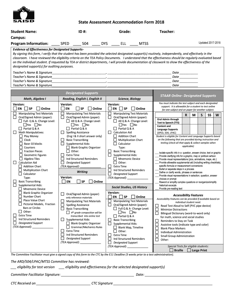 State Assessment Accommodation Form 2018 Student Name: ID #: Grade: Campus: Program Information: SPED 504 DY SELL MTSSTeacher: Updated 20172018Evidence of Effectiveness for Designated Supports signing