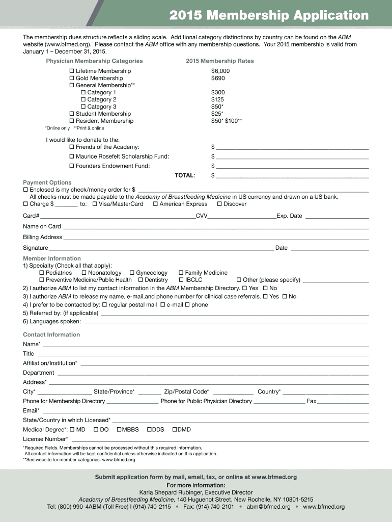 2015 Membership Application The membership dues structure reflects a sliding scale. Additional category distinctions by country can be found on the ABM website (www.bfmed.org). Please contact the