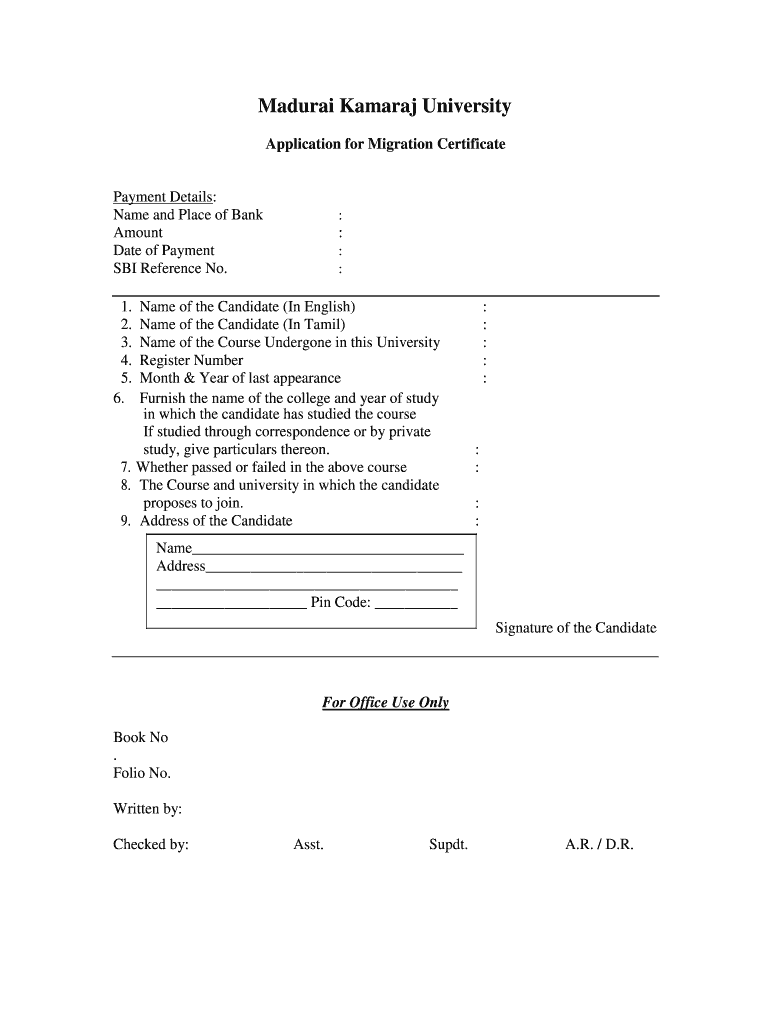 Madurai Samara University Application for Migration CertificatePayment Details: Name and Place of Bank Amount Date of Payment SBI Reference No.:: : :1. 2. 3. 4. 5. 6. Name of the Candidate (In English)