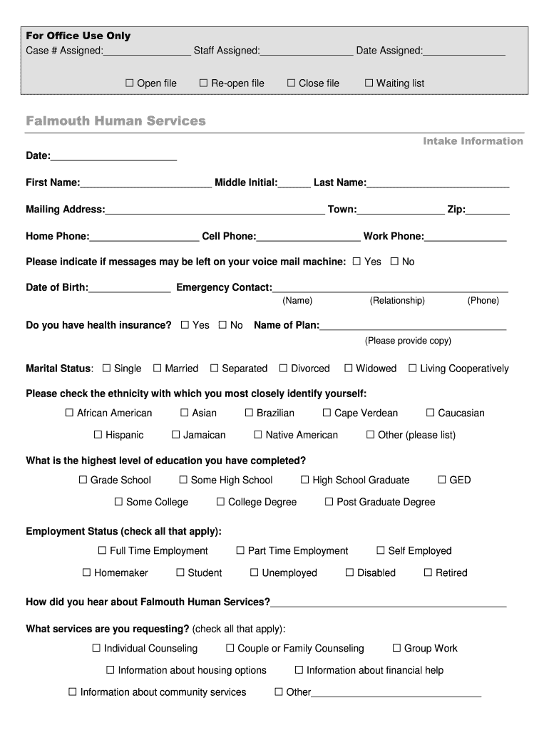 For Office Use Only Case # Assigned: Staff Assigned: Date Assigned: Open file Reopen file Close file Waiting listFalmouth Human Services Intake Information Date: First Name: Middle Initial: Last Name:
