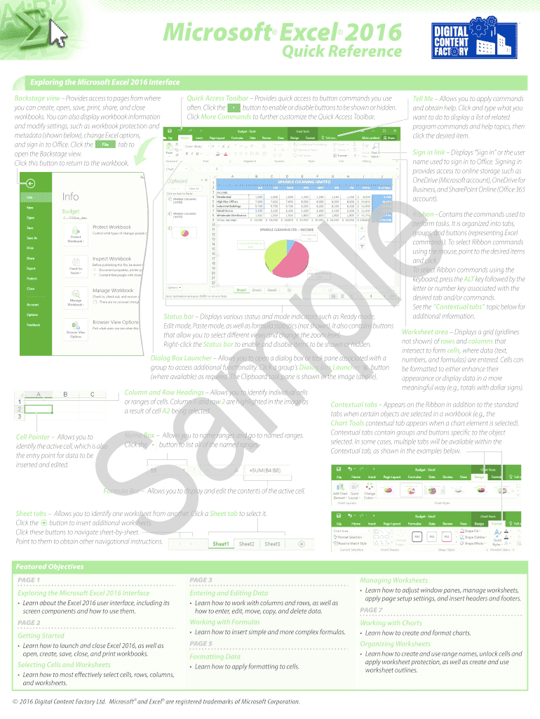 Microsoft Excel 2016 Quick ReferenceExploring the Microsoft Excel 2016 Interface Backstage view Provides access to pages from where you can create, open, save, print, share, and close workbooks. You