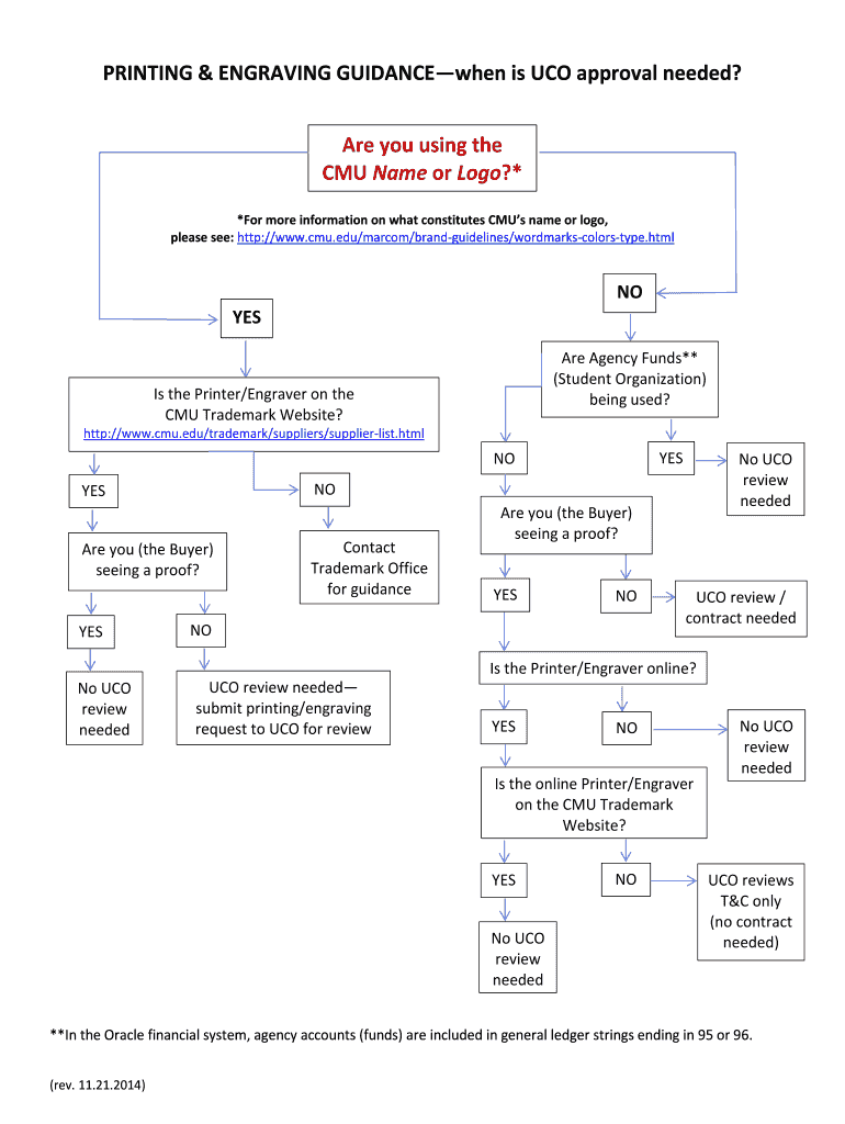 PRINTING & ENGRAVING GUIDANCE when is ECO approval needed? Are you using the CMU Name or Logo?* *For more information on what constitutes CMOS name or logo, please see: http://www.cmu.edu/marcom/brandguidelines/wordmarkscolorstype.htmlNOYESAre