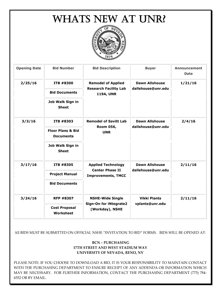 WHAT'S NEW AT UNR? Opening Dated Numbered DescriptionBuyerAnnouncement Date2/25/16ITB #8300 Bid DocumentsRemodel of Applied Dawn AllshouseResearch Facility Labdallshouse unr.edu1/21/16119A, UNR Job