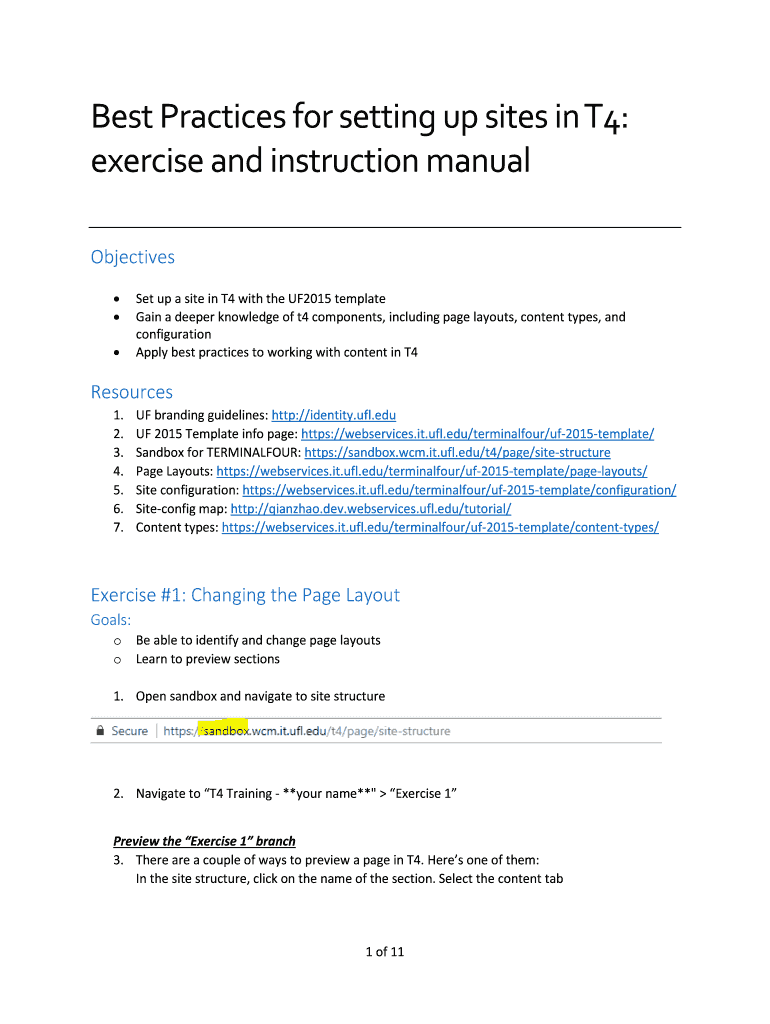 Best Practices for setting up sites in T4: exercise and instruction manual Objectives Set up a site in T4 with the UF2015 template Gain a deeper knowledge of t4 components, including page layouts,