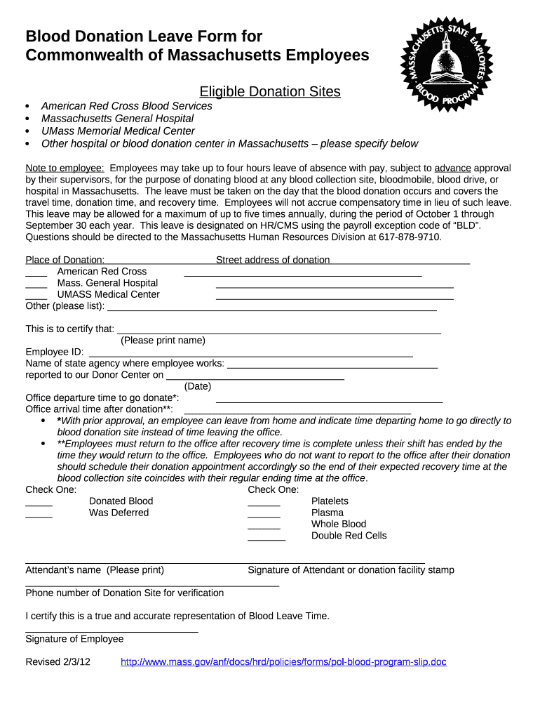 Blood Donation Leave Form for Commonwealth of Massachusetts EmployeesEligible Donation Sites American Red Cross Blood Services Massachusetts General Hospital Mass Memorial Medical Center Other hospital