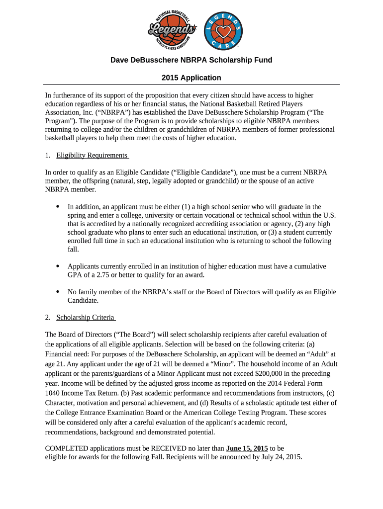 Dave DeBusschere NB RPA Scholarship Fund2015 Application In furtherance of its support of the proposition that every citizen should have access to higher education regardless of his or her financial