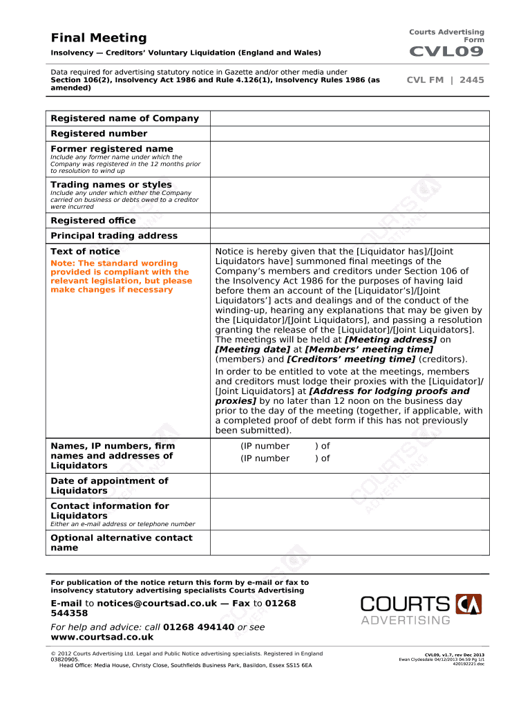 Registered name of Company Registered number Former registered name Include any former name under which the Company was registered in the 12 months prior to resolution to wind up Trading names or