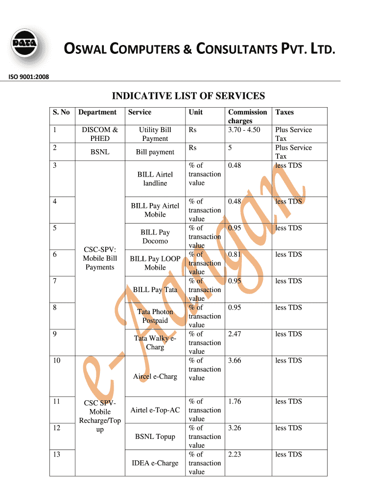 OSWALD COMPUTERS & CONSULTANTS PVT. LTD. ISO 9001:2008INDICATIVE INDICATIVE LIST OF SERVICES S. No 1 2DepartmentServiceDISCOM & PHEDUtility Bill PaymentBSNLBill payment3 BILL Airtel landline 4BILL