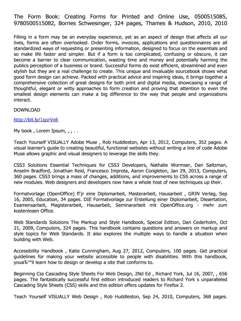 The Form Book: Creating Forms for Printed and Online Use, 0500515085, 9780500515082, Berries Schlesinger, 324 pages, Thames & Hudson, 2010, 2010 DOWNLOADhttp://bit.ly/1kl5Jcchttp://www.barnesandnoble.com/s/?storebook&keywordThe+Form+Book×3A+Creating+Forms+for+Printed+and+Online+Refilling