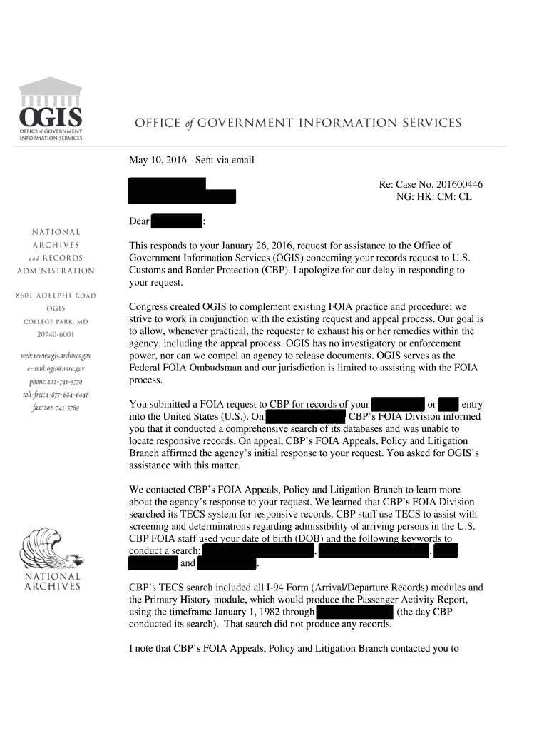 May 10, 2016, Sent via email Re: Case No. 201600446 NG: HK: CM: CL Dear:This response to your January 26, 2016, request for assistance to the Office of Government Information Services (OTIS) concerning