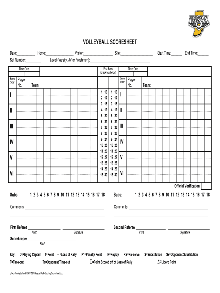 VOLLEYBALL SCORESHEET Date: Home: Visitor: Site: Set Number: Level (Varsity, JV or Freshmen): First Serve (check box below)Timeouts Serve Overplayed No.1 2 3 4 5 6 7 8 9 10 11 12 13 14 15I II III
