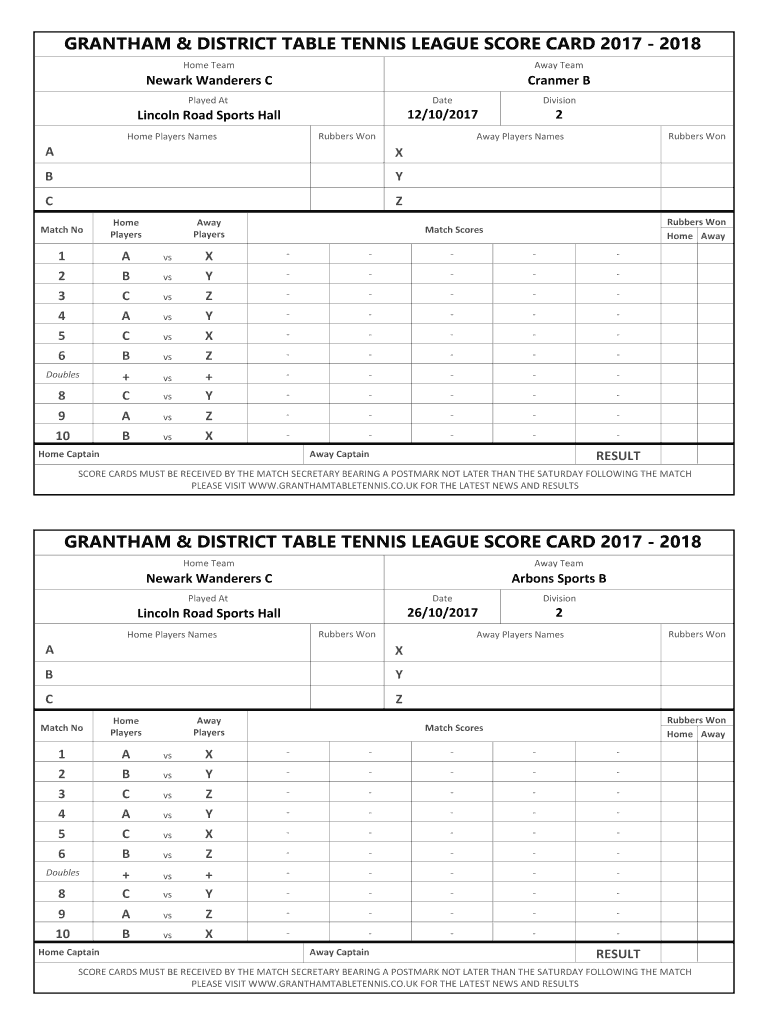 GRAHAM & DISTRICT TABLE TENNIS LEAGUE Scorecard 2017 2018 Home Tearaway Team Newark Wanderers Cranmer Played AtDateDivisionLincoln Road Sports Hall12/10/20172Rubbers Winsome Players NamesAXBYCZ Away