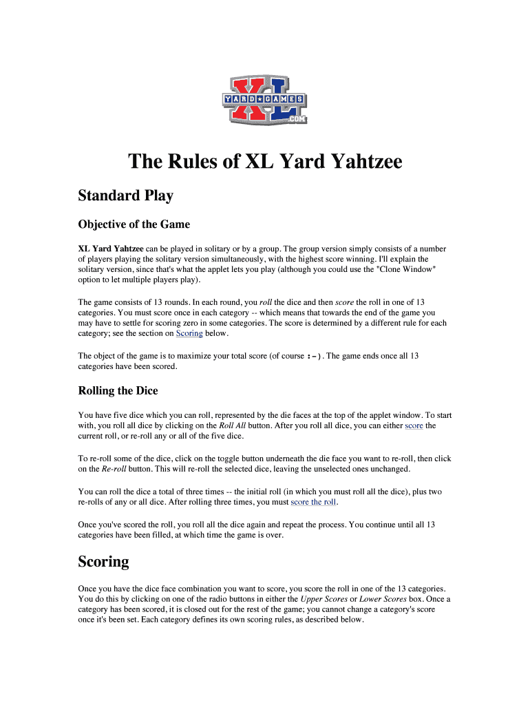 The Rules of XL Yard Yahtzee Standard Play Objective of the Game XL Yard Yahtzee can be played in solitary or by a group. The group version simply consists of a number of players playing the solitary