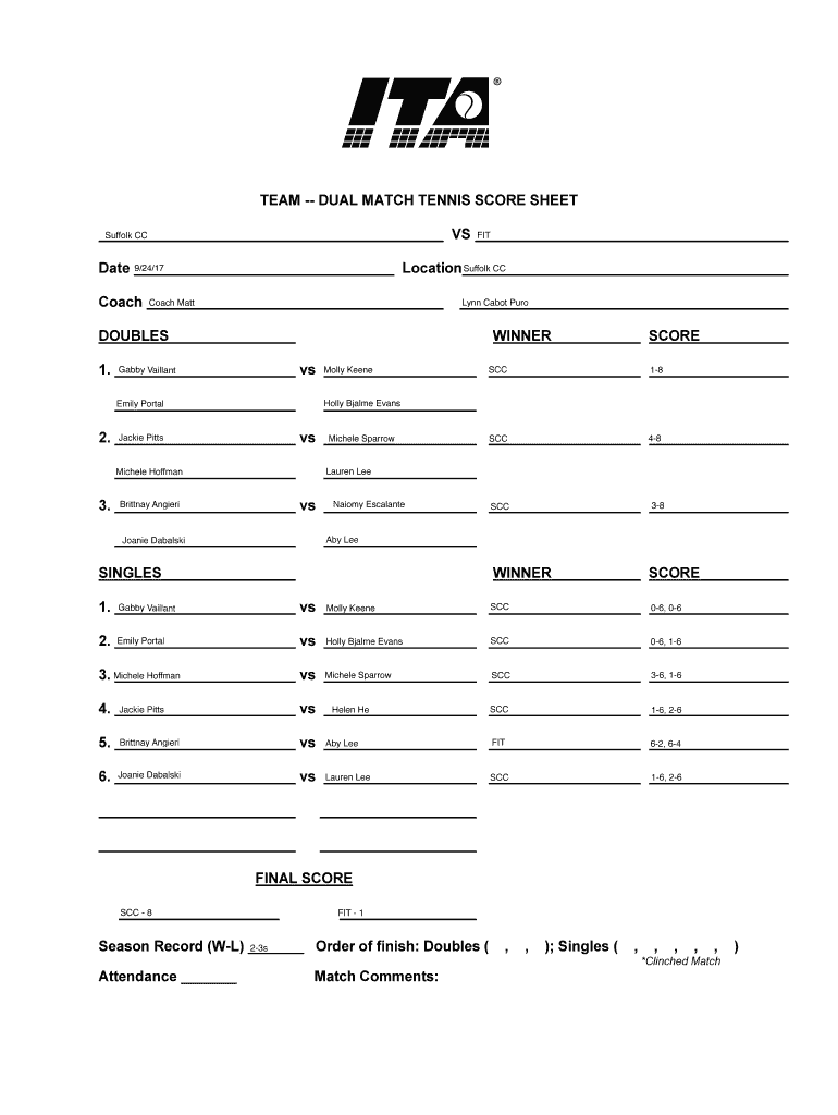 TEAM DUAL MATCH TENNIS Scoresheet VS Suffolk CCDateLocation Suffolk CC9/24/17CoachFITLynn Cabot PuroCoach MattDOUBLES 1. Gabby VaillantWINNER vs Jackie PittsvsBrittnay Angieri18SCC48Michele Sparrow