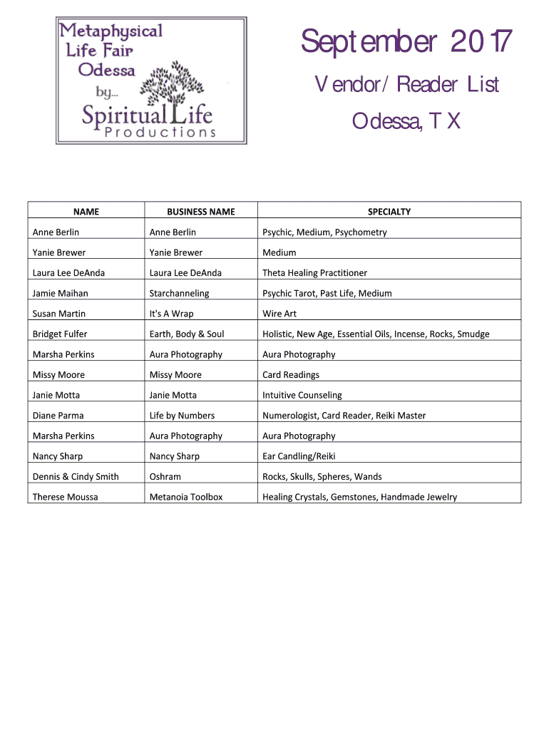 September 2017 Vendor/Reader List Odessa, TX NAMEBUSINESSNAMESPECIALTYAnneBerlinAnneBerlinPsychic, Medium, PsychometryYanieBrewerYanieBrewerMediumLauraLeeDeAndaLauraLeeDeAndaThetaHealingPractitionerJamieMaihanStarchannelingPsychicTarot,