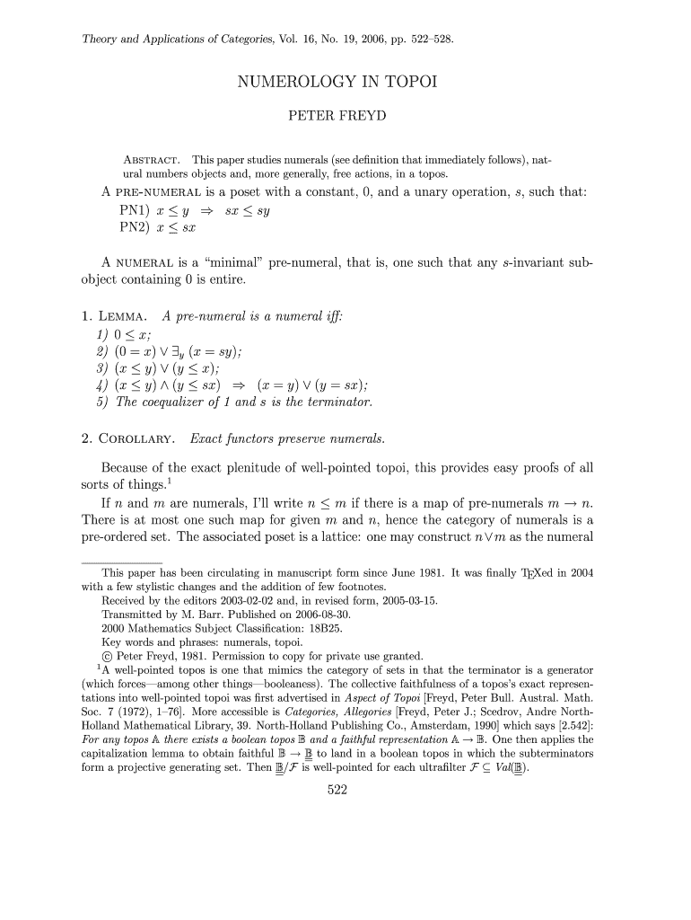 Theory and Applications of Categories, Vol. 16, No. 19, 2006, pp. 522528.NUMEROLOGY IN TOPI PETER FRED Abstract. This paper studies numerals (see dentition that immediately follows), natural numbers