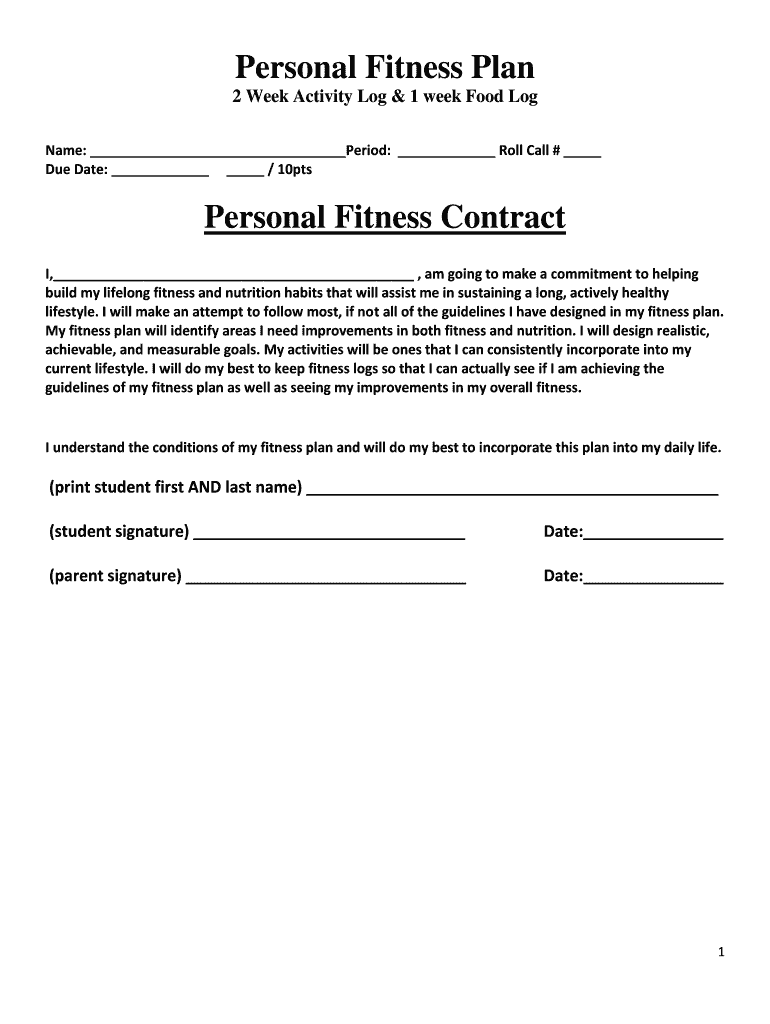 Personal Fitness Plan 2 Week Activity Log & 1 week Food Log Name: Period: Roll Call # Due Date: / 10ptsPersonal Fitness Contract I, am I going to make a commitment to helping build my lifelong fitness