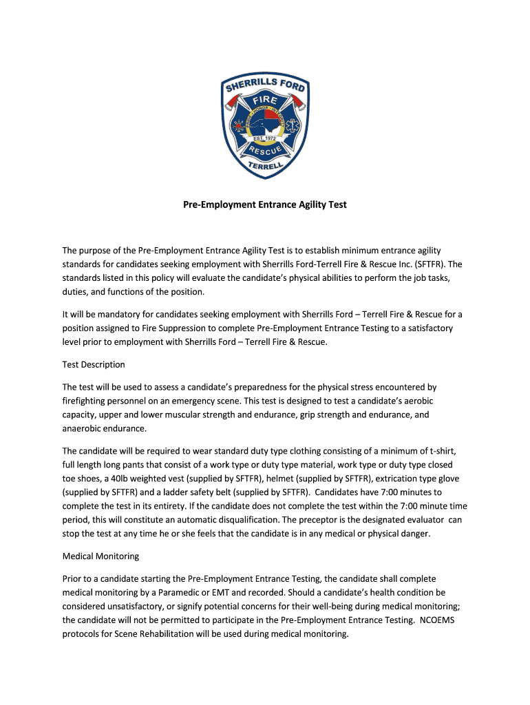 PreEmployment Entrance Agility Testate purpose of the PreEmployment Entrance Agility Test is to establish minimum entrance agility standards for candidates seeking employment with Sherrill Ford Terrell