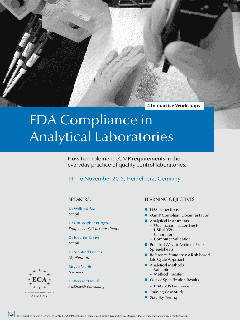 4 Interactive Workshops FDA Compliance in Analytical Laboratories How to implement camp requirements in the everyday practice of quality control laboratories. 14 16 November 2012, Heidelberg, Germany