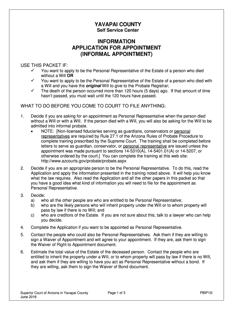 YAVAPAI COUNTY Self Service CenterINFORMATION APPLICATION FOR APPOINTMENT (INFORMAL APPOINTMENT) USE THIS PACKET IF: You want to apply to be the Personal Representative of the Estate of a person who