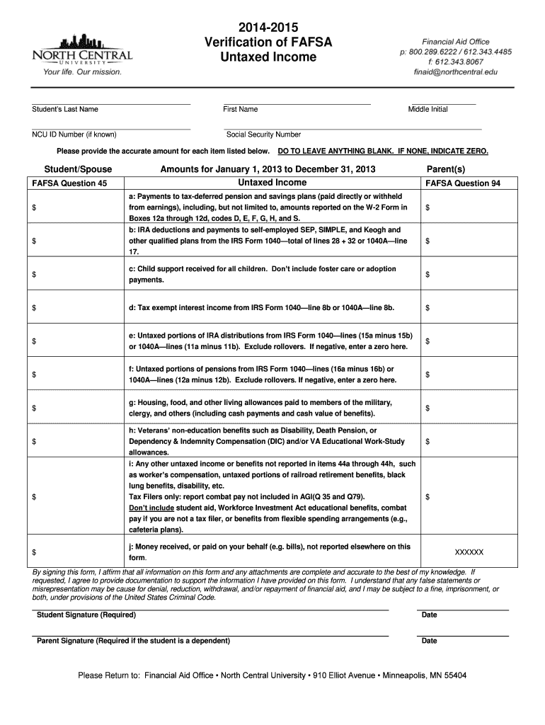 The FAFSA Untaxed Income Verification Form is a crucial document used within the financial aid application process. This form serves to report untaxed income, ensuring that students and parents can accurately represent their financial situation. Correct reporting of this income is essential, as institutions like North Central University utilize this information to assess eligibility for financial aid. By completing the FAFSA untaxed income form, applicants contribute to a clearer understanding of their financial needs.