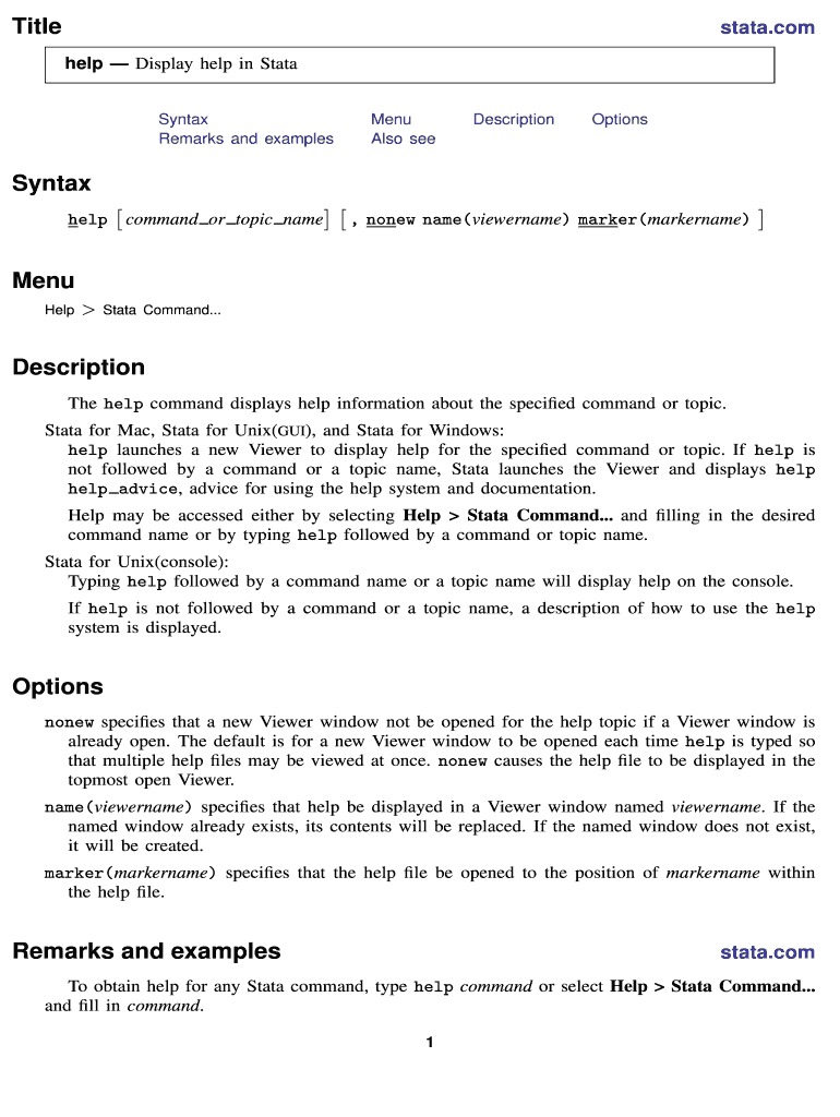 Titlestata.com help Display help in State Syntax Remarks and examplesMenu Also seeDescriptionOptionsSyntax help command or topic name, none name(viewer name) marker(marker name)Menu Hallstatt Command...