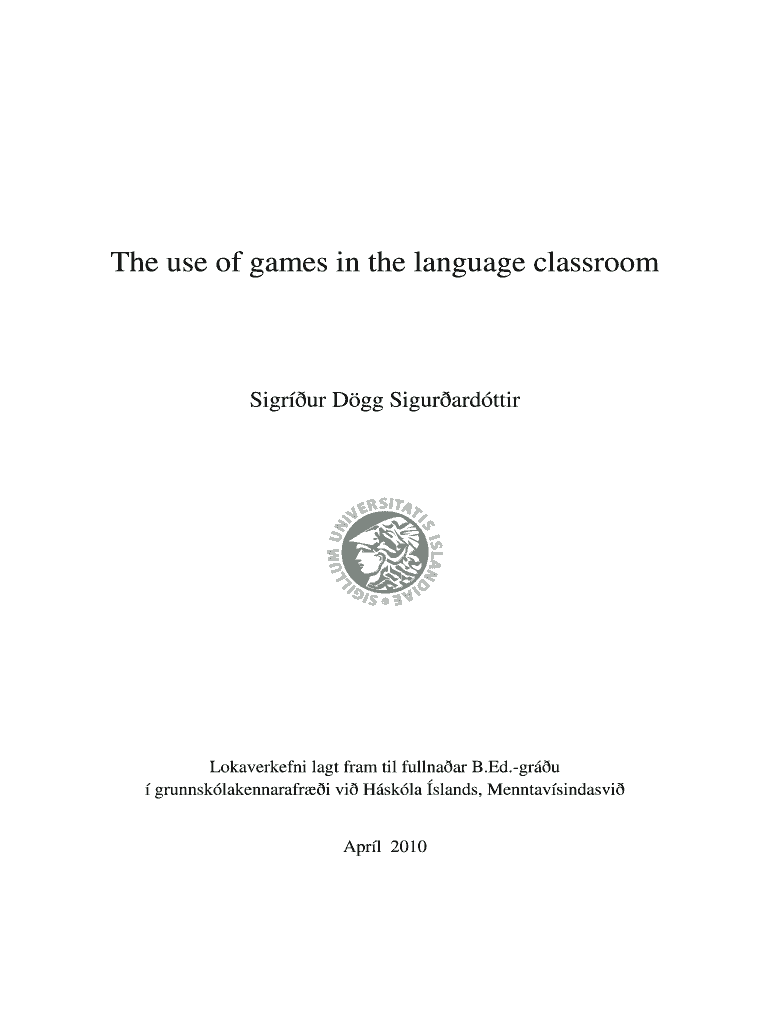 The use of games in the language classroomSigrur Dog SigurardttirLokaverkefni last from til fullback B. Ed. GRU grunnsklakennarafri vi Ska islands, Menntavsindasvi April 2010Lokaverkefni til B. Ed.