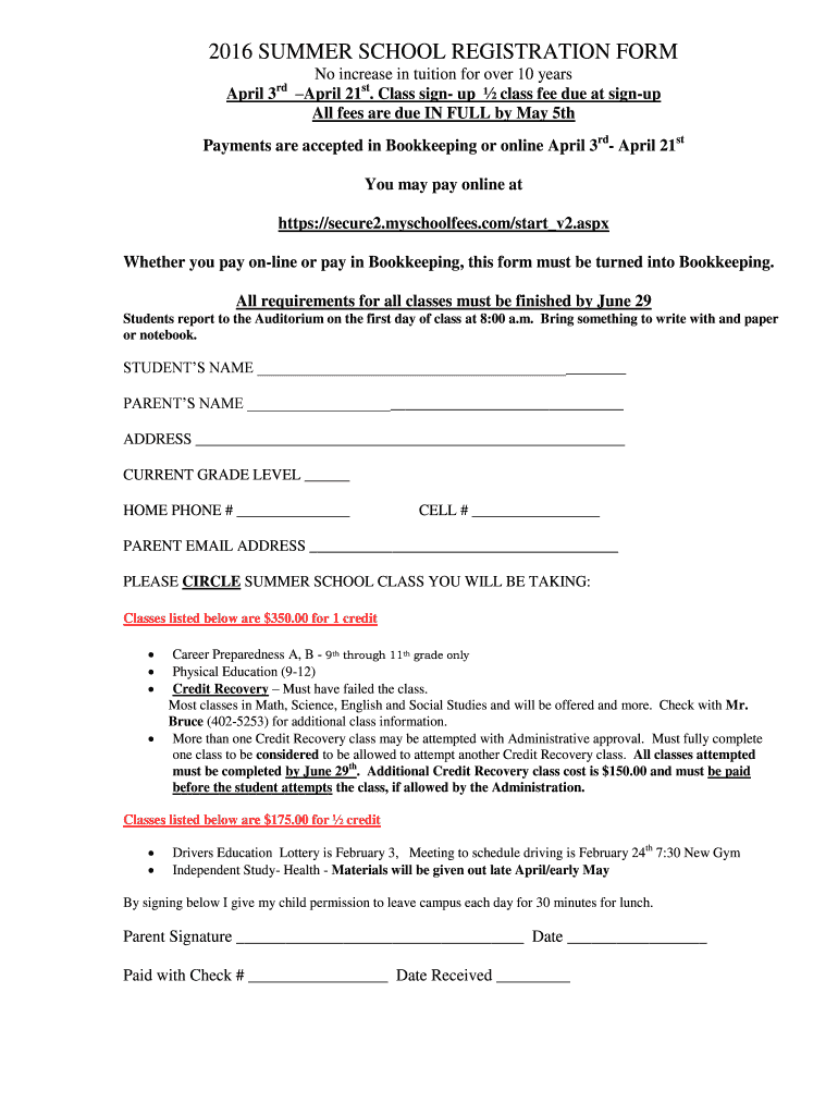 2016 SUMMER SCHOOL REGISTRATION From No increase in tuition for over 10 years April 3rd April 21st. Class sign up class fee due at sign up All fees are due IN FULL by May 5th Payments are accepted