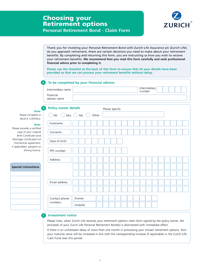 Choosing your Retirement options Personal Retirement Bond Claim Firsthand you for investing your Personal Retirement Bond with Zurich Life Assurance plc (Zurich Life). As you approach retirement,