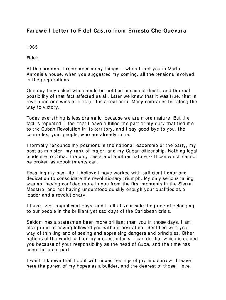 Farewell Letter to Fidel Castro from Ernesto Che Guevara 1965 Fidel: At this moment I remember many things when I met you in Maria Antonia's house, when you suggested my coming, all the tensions involved