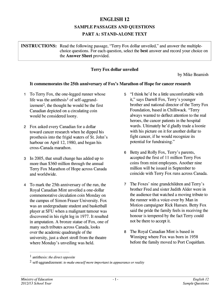 INSTRUCTIONS: Read the following passage, Terry Fox dollar unveiled, and answer the multiple choice questions. For each question, select
