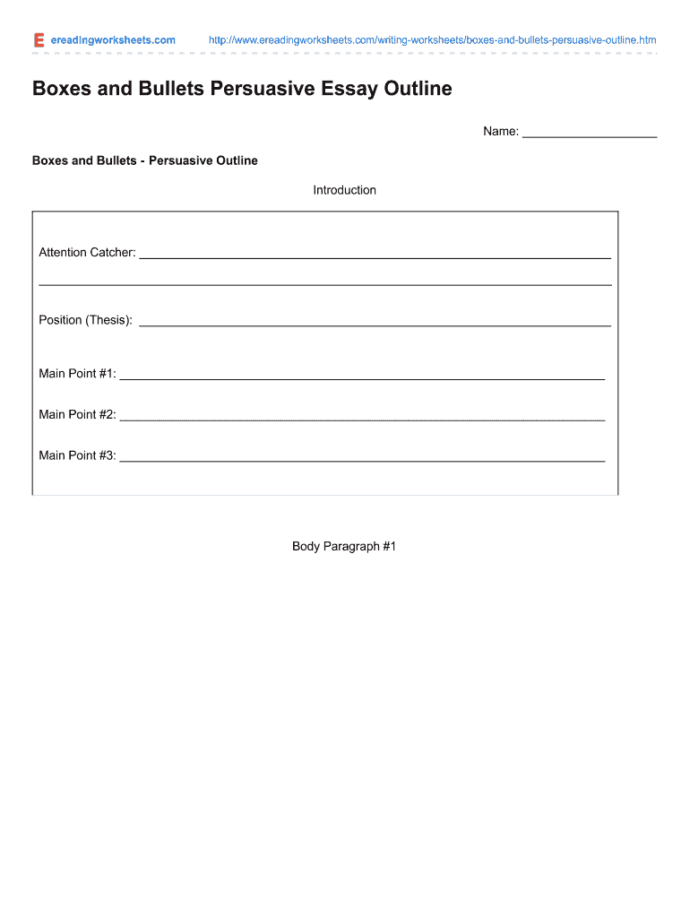 Ereadingworksheets.combat://www.ereadingworksheets.com/writingworksheets/boxesandbulletspersuasiveoutline.htmBoxes and Bullets Persuasive Essay Outline Name: Boxes and Bullets Persuasive Outline IntroductionAttention