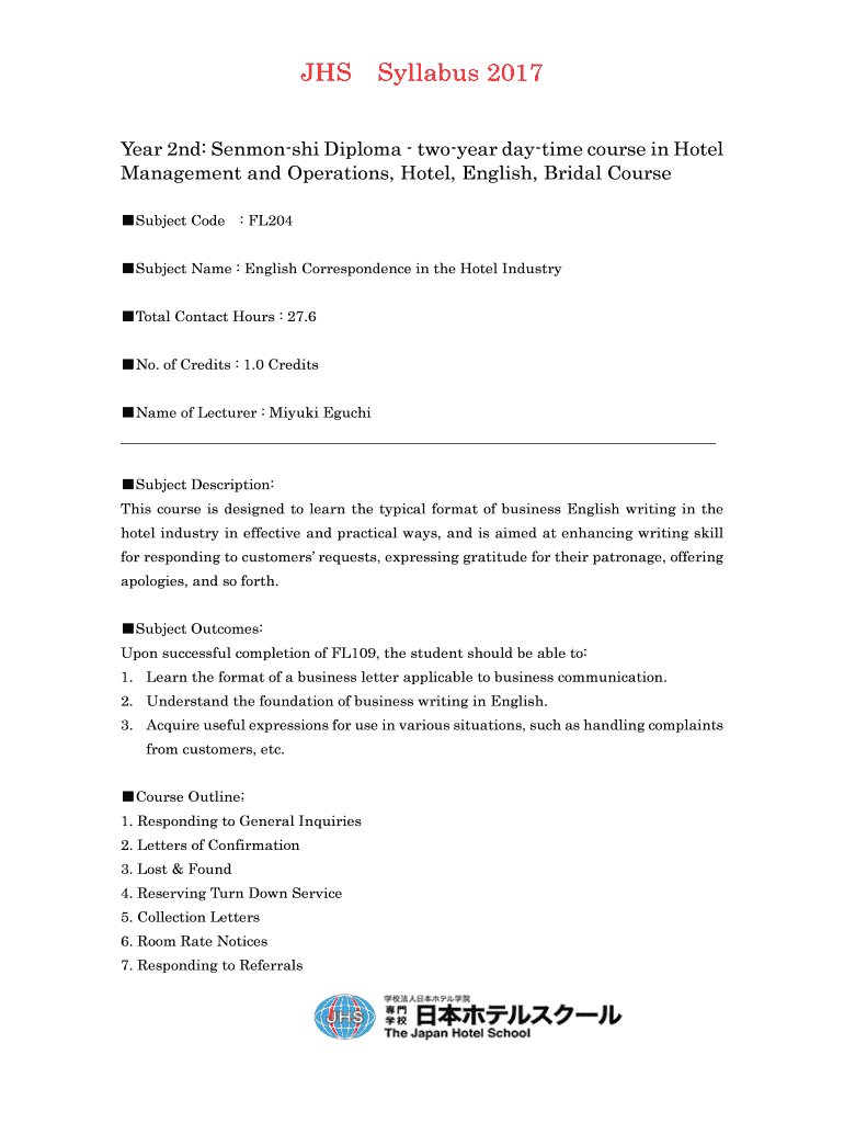 JHS Syllabus 2017 Year 2nd: Sermons Diploma two year daytime course in Hotel Management and Operations, Hotel, English, Bridal Course Subject Code : FL204 Subject Name : English Correspondence in