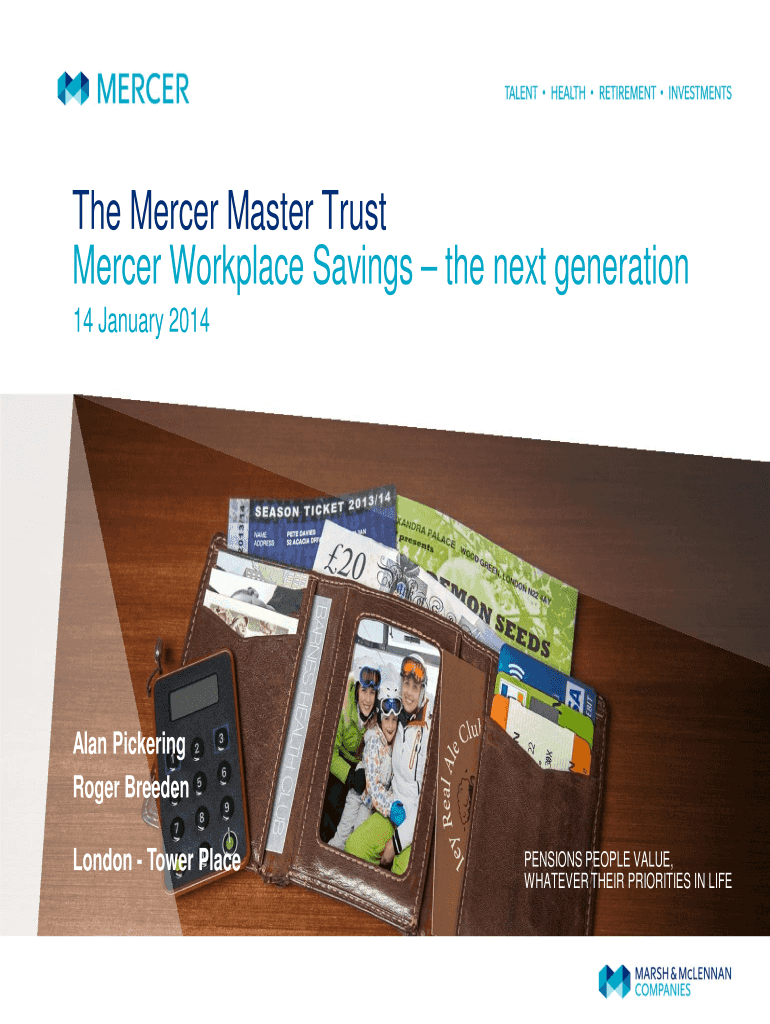The Mercer Master Trust Mercer Workplace Savings the next generation 14 January 2014Alan Pickering Roger Breeder London Tower PlacePENSIONS PEOPLE VALUE, WHATEVER THEIR PRIORITIES IN Discontent 1Master