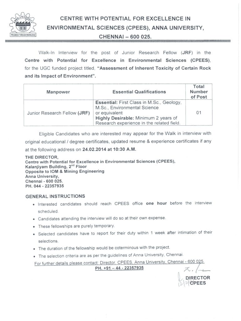 Center WITH POTENTIAL FOR EXCELLENCE IN ENVIRONMENTAL SCIENCES (CREES), ANNA UNIVERSITY, CHENNAI 600 025. CentreWalkInInterviewforthewithPotentialforExcellencefor the UGC fundedpostofJuniorinResearch(JR)FellowEnvironmentalSciencesinthe(CREES),