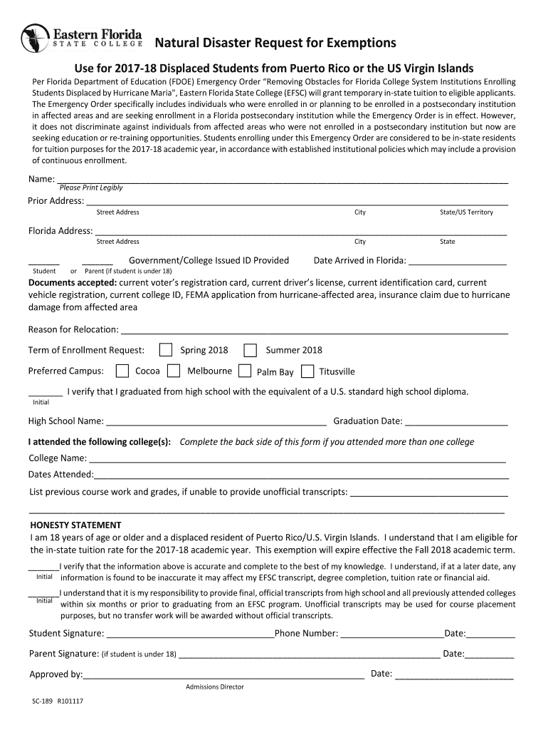 Natural Disaster Request for Exemptions Use for 201718 Displaced Students from Puerto Rico or the US Virgin Islander Florida Department of Education (FOE) Emergency Order Removing Obstacles for Florida