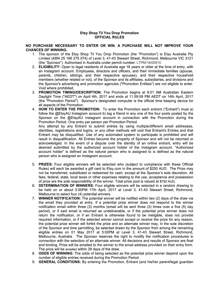 Etsy Shop Til You Drop Promotion OFFICIAL RULES NO PURCHASE NECESSARY TO ENTER OR WIN. A PURCHASE WILL NOT IMPROVE YOUR CHANCES OF WINNING. 1. The sponsor of the Etsy Shop Til You Drop Promotion (the