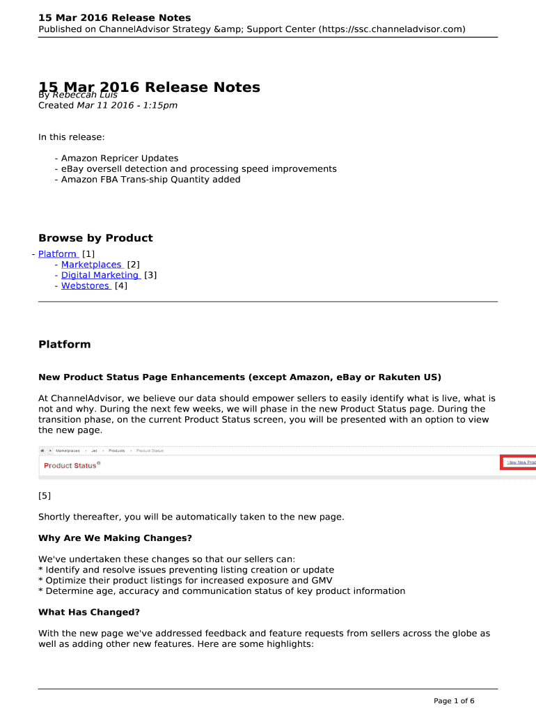 15 Mar 2016 Release Notes Published on ChannelAdvisor Strategy & Support Center (https://ssc.channeladvisor.com)15 Mar 2016 Release Notes By Rebecca Luis Created Mar 11 2016 1:15pmIn this release: