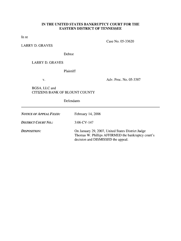 IN THE UNITED STATES BANKRUPTCY COURT FOR THE EASTERN DISTRICT OF TENNESSEE In re Case No. 0533620 LARRY D. GRAVES Debtor LARRY D. GRAVES Plaintiff v. Adv. Pro. No. 053387 BSA, LLC and CITIZENS BANK