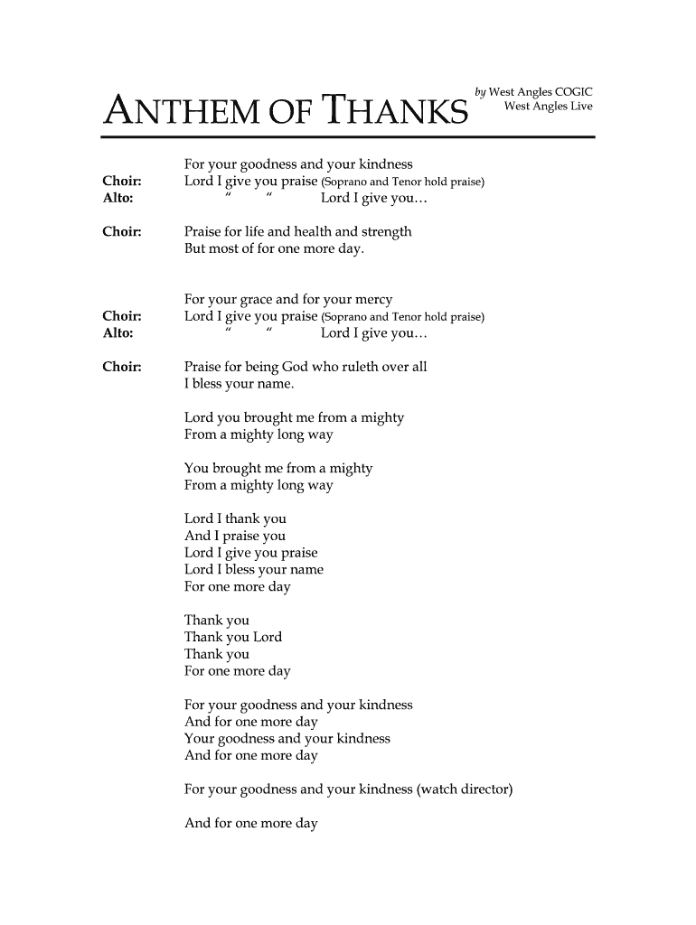 ANTHEM OF THANKS Choir: Alto: Choir:Choir: Alto: Choir:by West Angles COMIC West Angles Liver your goodness and your kindness Lord I give you praise (Soprano and Tenor hold praise) Lord I give you