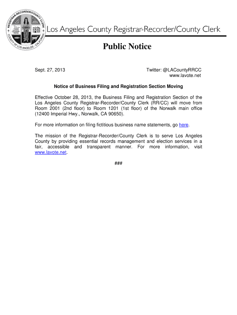Public Notice Sept. 27, 2013Twitter: LACountyRRCC www.lavote.netNotice of Business Filing and Registration Section Moving Effective October 28, 2013, the Business Filing and Registration Section of