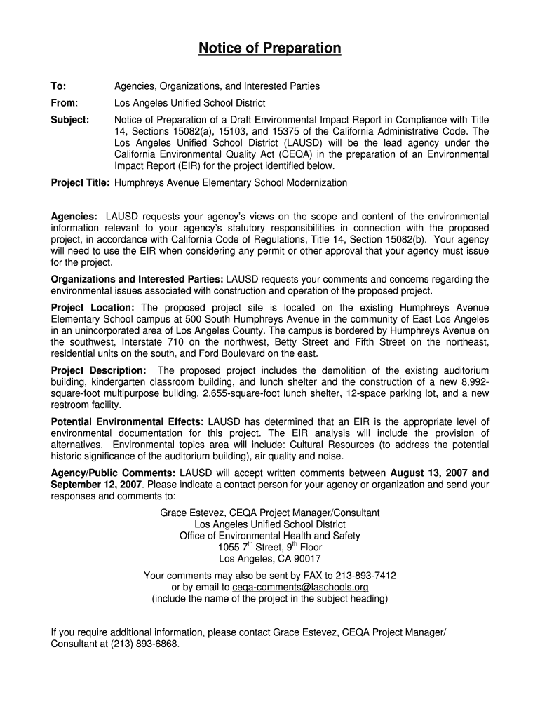 To:Agencies, Organizations, and Interested PartiesFrom:Los Angeles Unified School DistrictSubject:Notice of Preparation of a Draft Environmental Impact Report in Compliance with